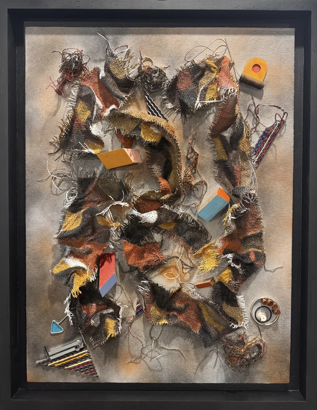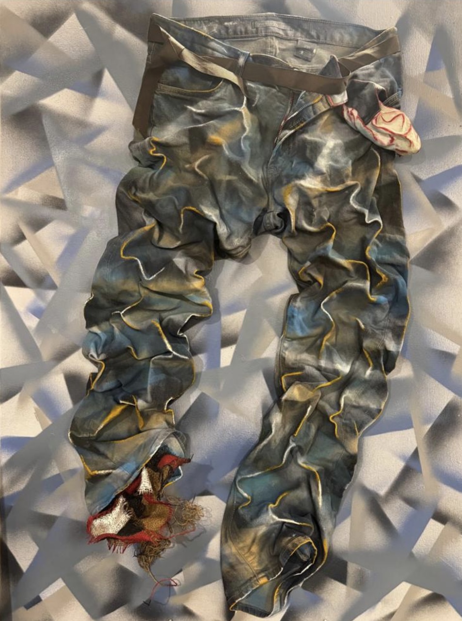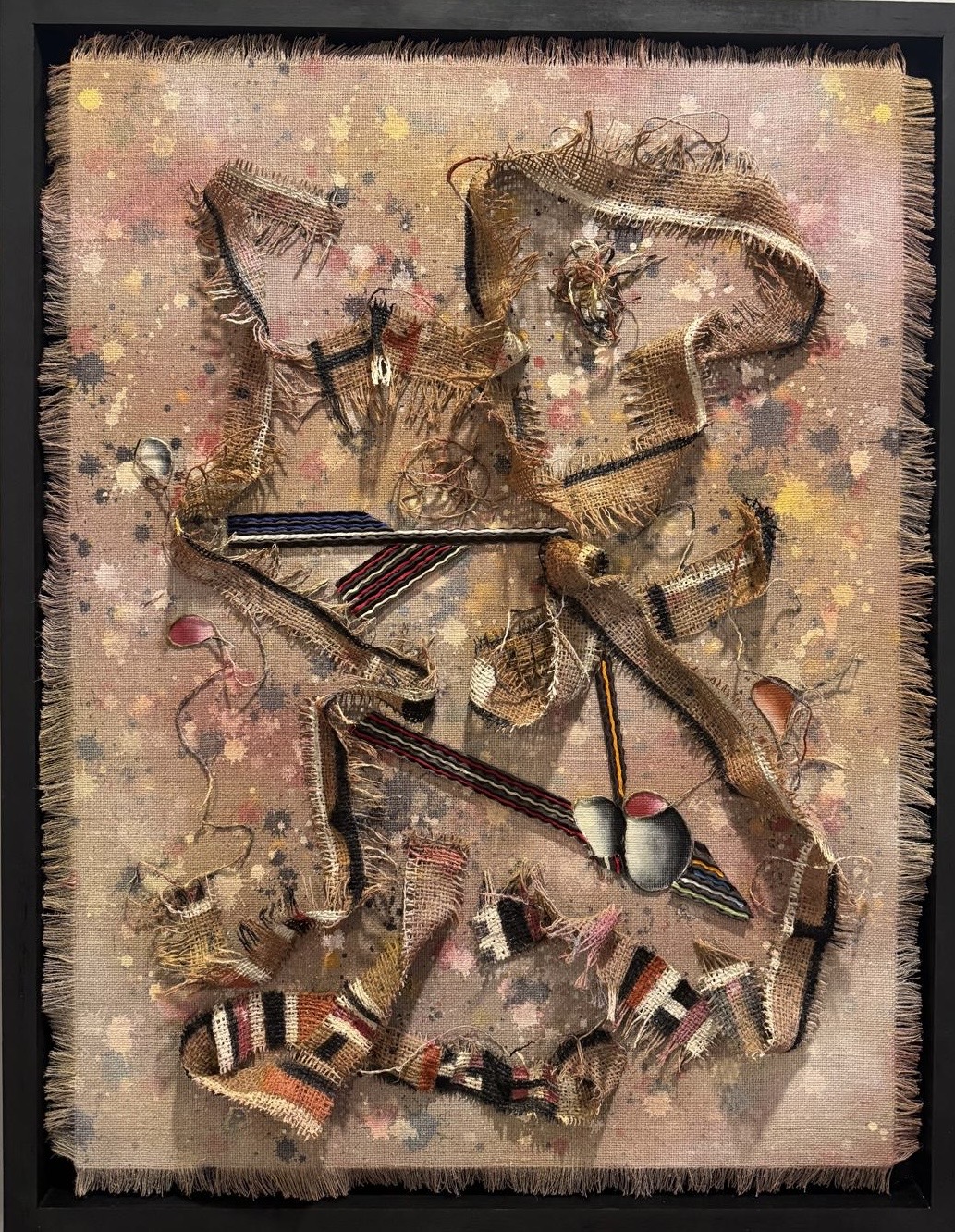 Bukiya’s work is distinguished by his transformation of reclaimed fabrics, ephemera and everyday materials into vivid Pop inflected compositions. Through the layering of paint, text, found objects and digital elements, he reframes the familiar, imbuing it with new emotional resonance. These materials; worn textiles, fragments of domestic life, objects marked by time become carriers of memory. In Bukiya’s hands, they evoke nostalgia, personal history and the quiet persistence of human experience.