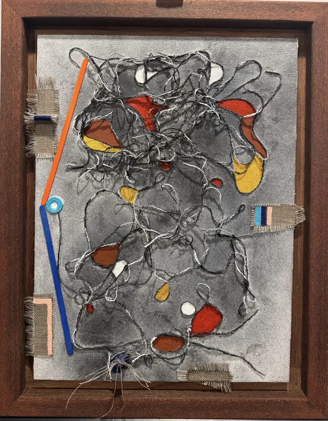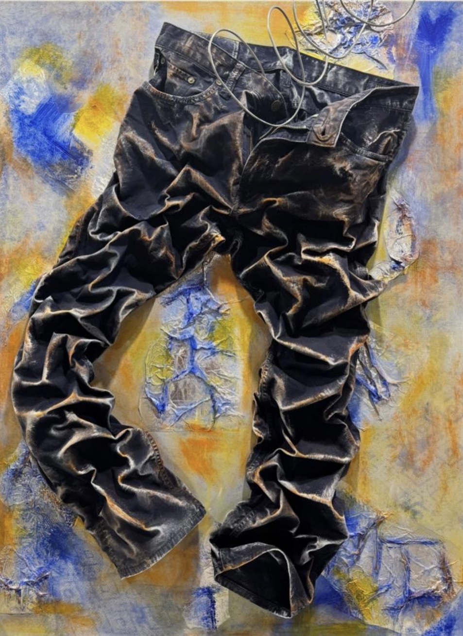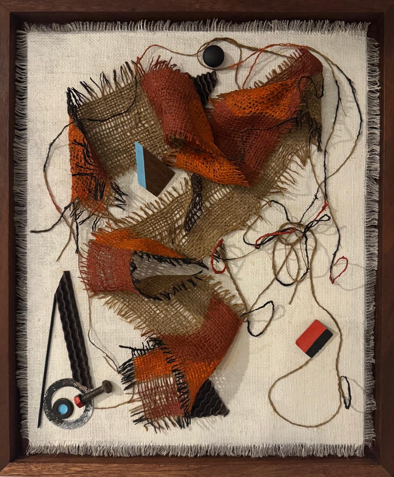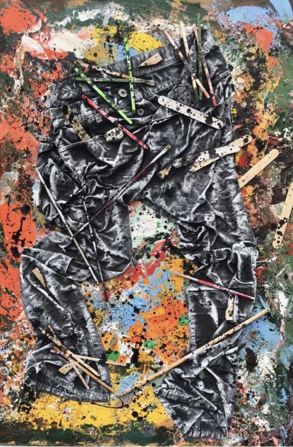 Bukiya’s work is distinguished by his transformation of reclaimed fabrics, ephemera and everyday materials into vivid Pop inflected compositions. Through the layering of paint, text, found objects and digital elements, he reframes the familiar, imbuing it with new emotional resonance. These materials; worn textiles, fragments of domestic life, objects marked by time become carriers of memory. In Bukiya’s hands, they evoke nostalgia, personal history and the quiet persistence of human experience.